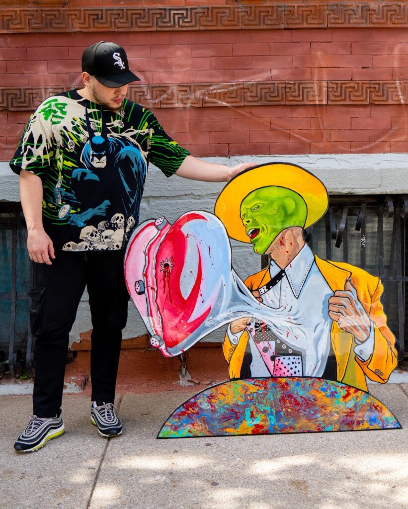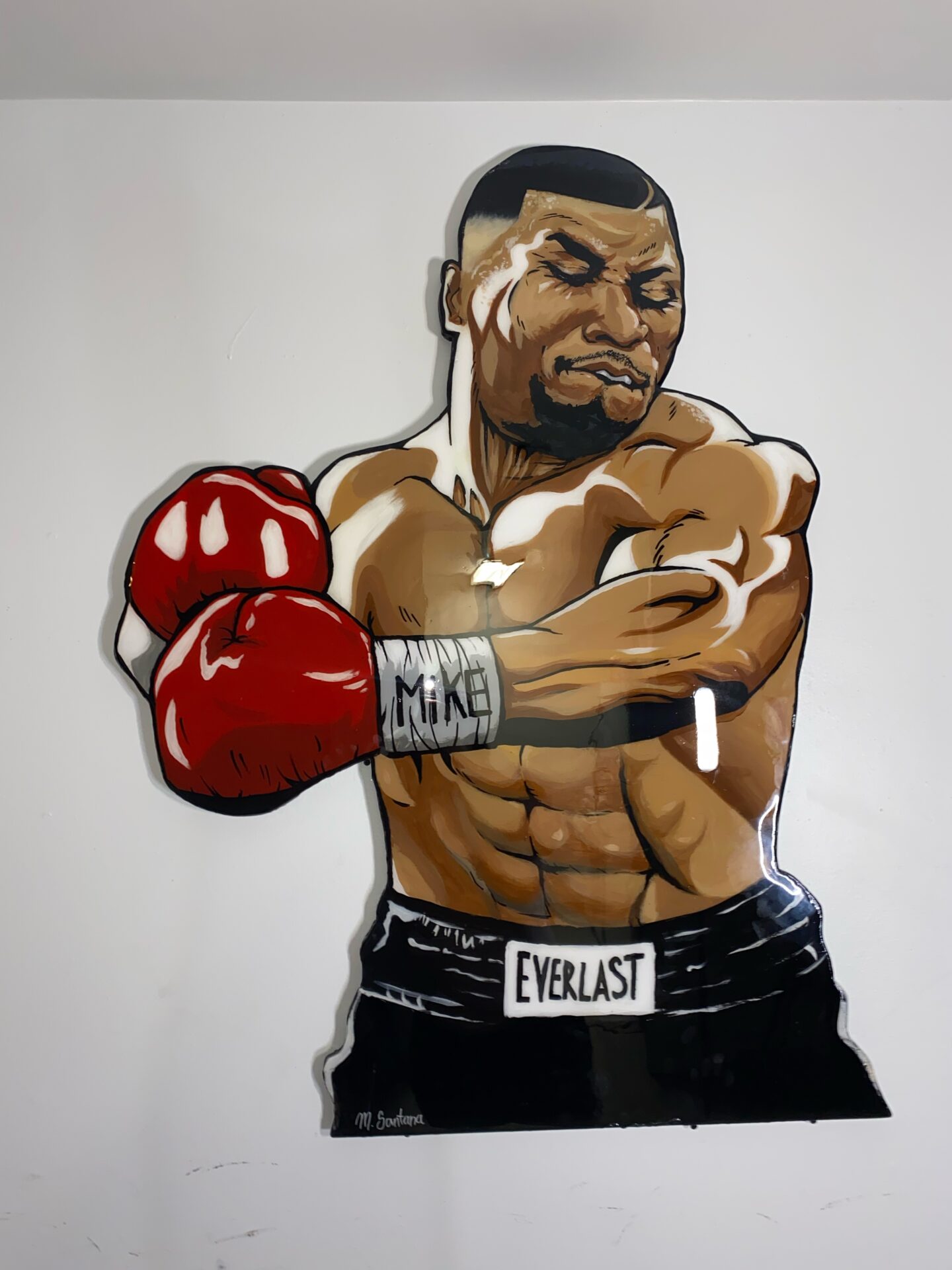 My paint style is realism mixed with pop art lines. My paintings canvases for this collection starts as 8ft x 4ft board of pine plywood. I personalize my own designs, I draw the outline of my image on the wood, then cut it out with a jig saw. I hand paint my ideas using acrylic paint, then epoxy resin over it to give it glassy gloss finish.